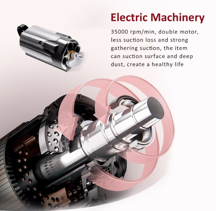 • 35000 rpm/min, double motor, less suction loss, and strong gathering suction, the item can suction surface and deep dust, create a healthy life