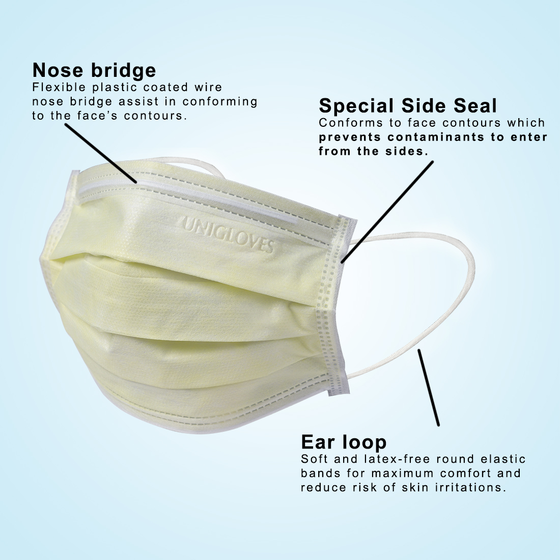 3ply Disposable surgical face mask with non-fiber-glass filter medium (Melt Blown), integrated nose bridge, soft non irritating elastic bands (Earloop).