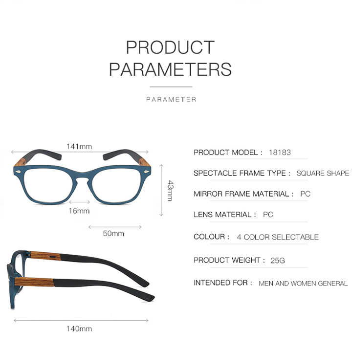 Reading glasses made of PC frame, PC lens. Square frame, integrated frame, comfortable nose pads, spring hinges.HD Vision and UV400 can restore true colors and protect eyes. The ideal gift for parents and friends. Suitable for reading. The design of fashion business is simple and young, showing a unique taste.