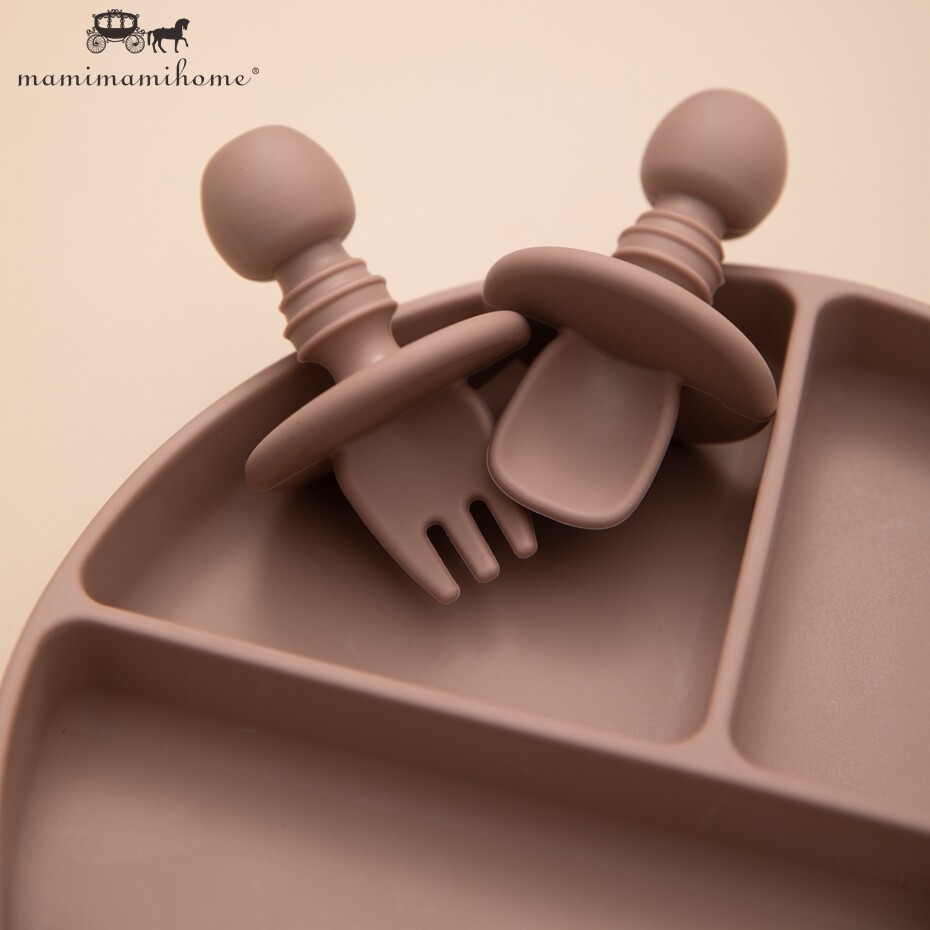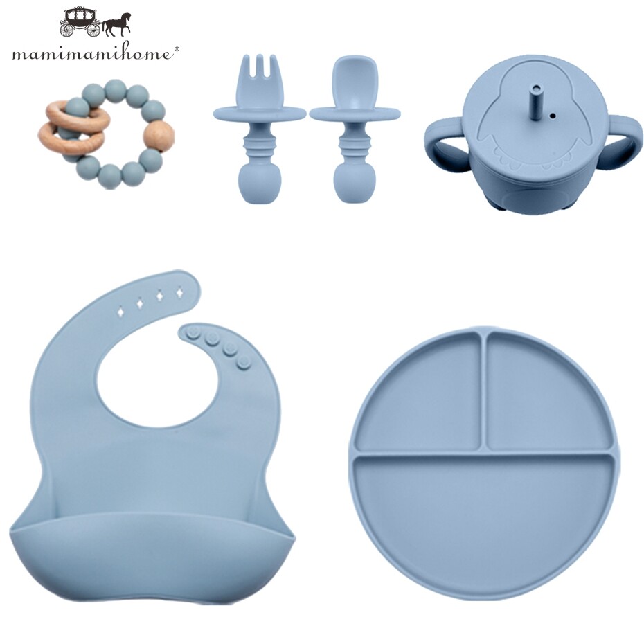 Mamimami Home Baby Feeding Meal Set 5pcs 100% Silicone Anti-fall Suction Plate,Spoon & Fork,Sippy Cup,Soft Bib