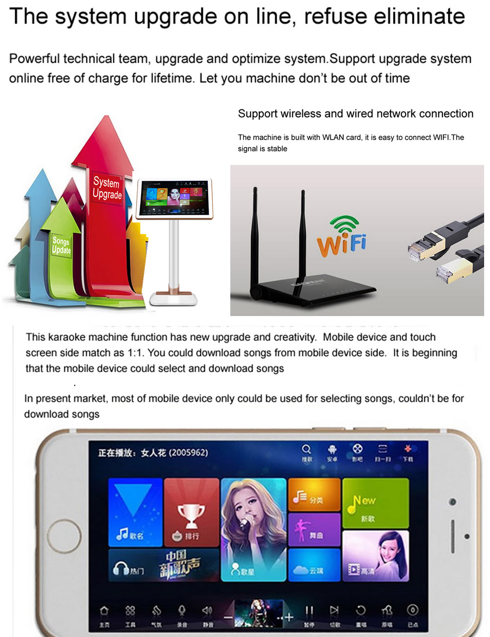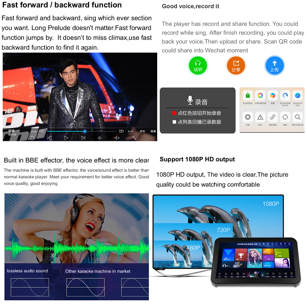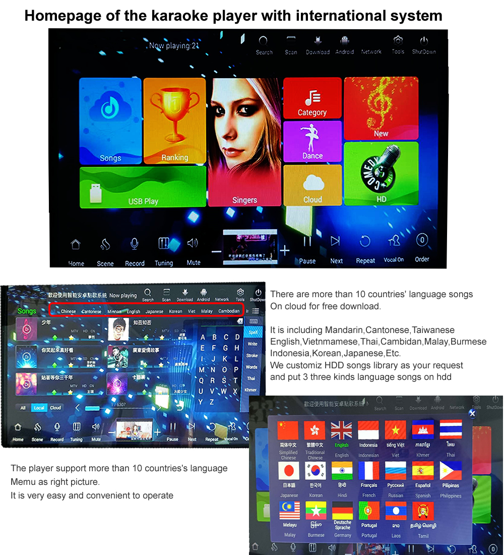 3.Smart AI Order songs,Record and share.The mainboard support two system.Chinese universal system and International system.You could select a suitable one.Universal system could support Simple Chinese,Traditional Chinese,English operation menu and searching.International system support more than 10Countries language menu and searching. Also International system songs category is more than Universal system. Chinese Universal system support Smart AI,Record and share.Score.