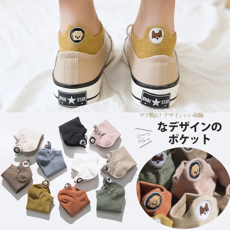 (SG Seller) Women Funny Ankle Socks Embroidered Animal Pug Cute Socks Kawaii Cartoon Candy Color Breathable Cotton Boat Socks