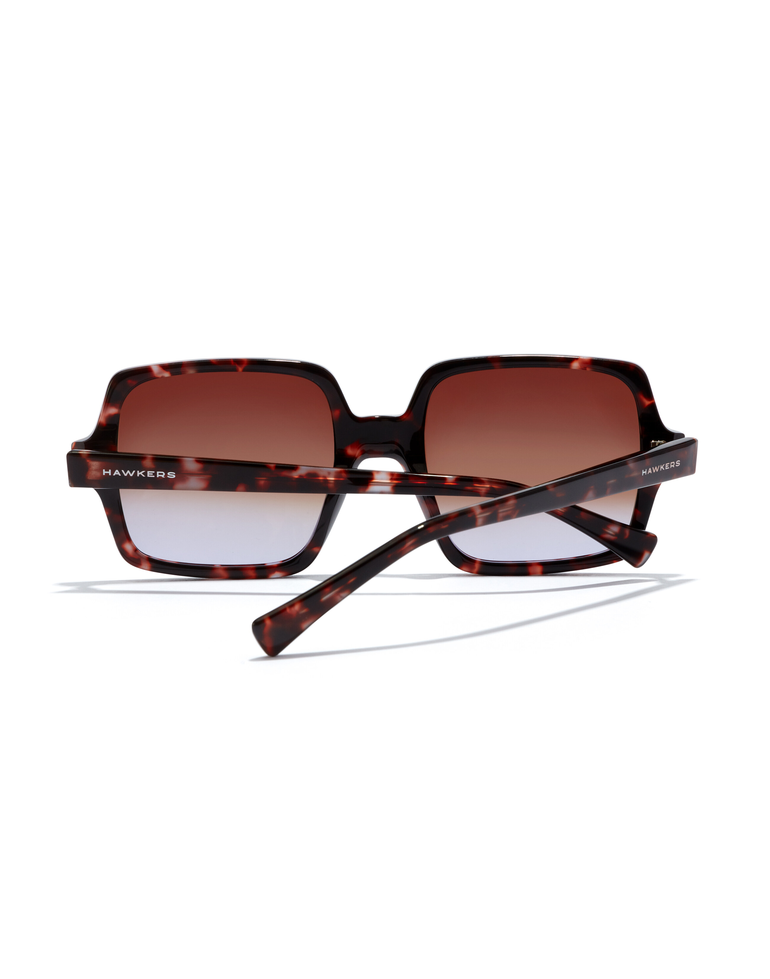 A 70s retro design. Outsized, squared rims and slender temples in dark brown-lilac tortoiseshell acetate with gradient brown-to-lilac lenses.