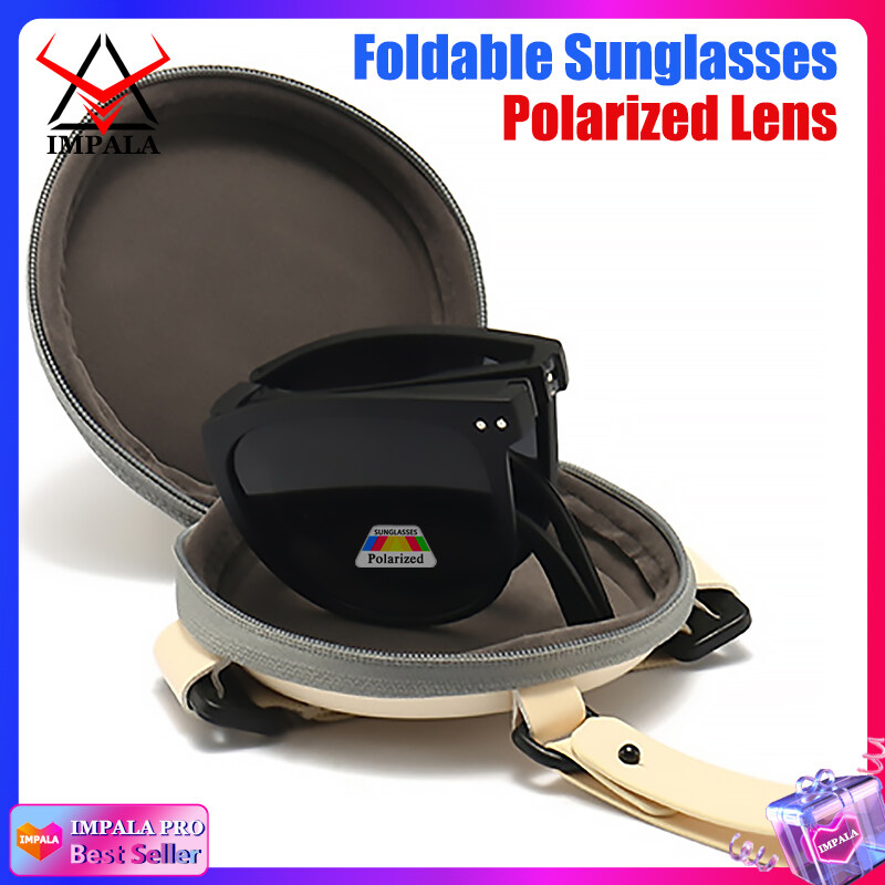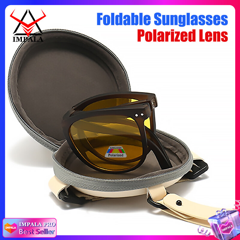 IMPALA PG1645Y Fashion Korean Style Polarized Foldable Sunglasses for Women HD Lens Sun Glasses with Cute Round Glasses Case Anti Glare UV400 Protective Sun Glasses