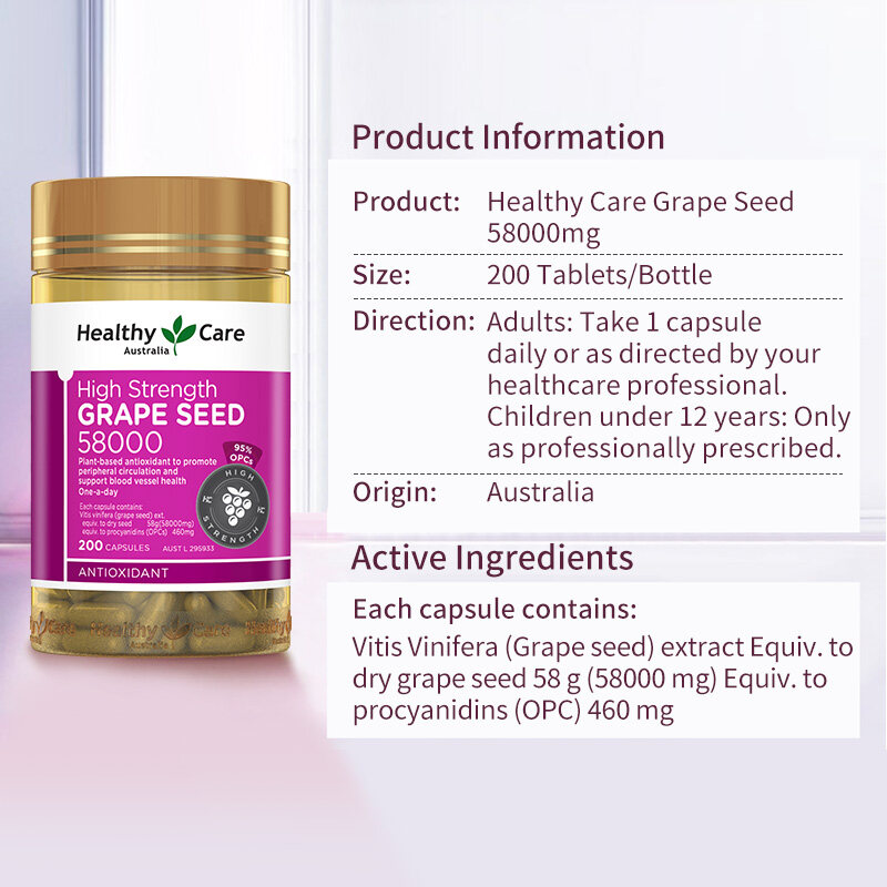 Healthy Care High Strength GrapeSeed 58000 is an advanced formula of a powerful plant-based antioxidant. It contains a rich natural source of flavonoids, including Oligomeric proanthocyanidins (OPCs), which protects the body cells from damage caused by free radicals.Healthy Care High Strength GrapeSeed 58000 is formulated with high quality ingredients to:- Help enhance collagen formation.- Maintain blood circulation to the peripheral areas of the body (legs, hands and feet).- Maintain cardiovascular system health.- Maintain blood capillary and vessel health.Benefits include:- Helps reduce free radical damage to body cells.- Helps to maintain general health and wellbeing.- Helps enhance blood circulation to the peripheral areas of the body (legs, hands and feet).- Helps to maintain cardiovascular system health.- Helps to maintain blood vessel and capillary health.Each capsule contains:Vitis Vinifera (GrapeSeed) extractEquiv. to dry grapeseed 58 g (58000 mg)Equiv. to procyanidins (OPC) 460 mgAdults: Take 1 capsule daily or as directed by your healthcare professional.Children under 12 years: Only as professionally prescribed.