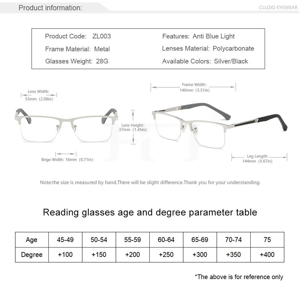 +0.5 to +6.0 Business Reading Glasses Men Metal Optical Frame Lens Anti Blue Light Presbyopia Glasses With Grade