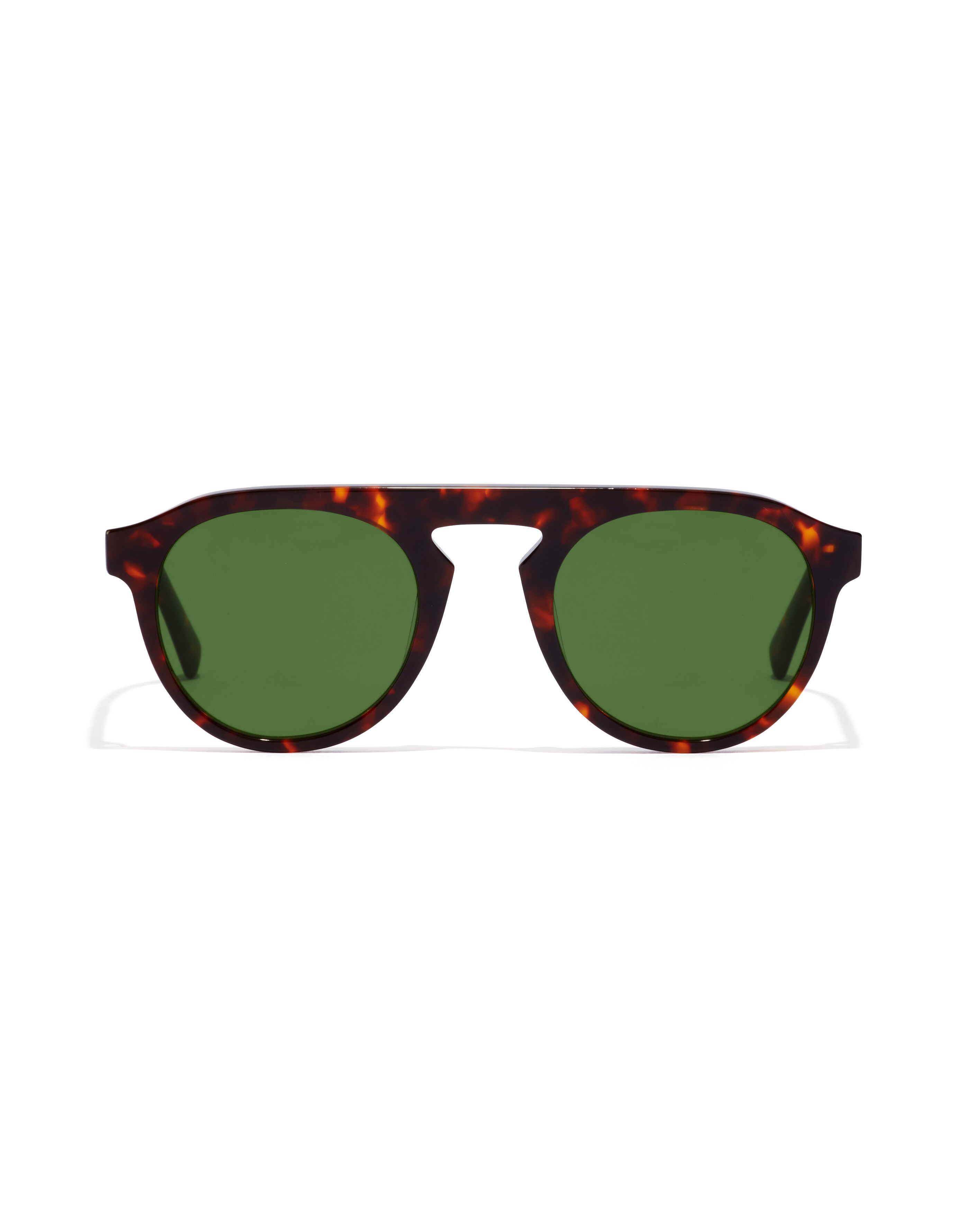 The unconventional flat browline and truncated keyhole bridge of this model belie the simplicity of the overall design at first glance. Rounded bottle green lenses perfectly complement the shiny brown havana acetate frame.