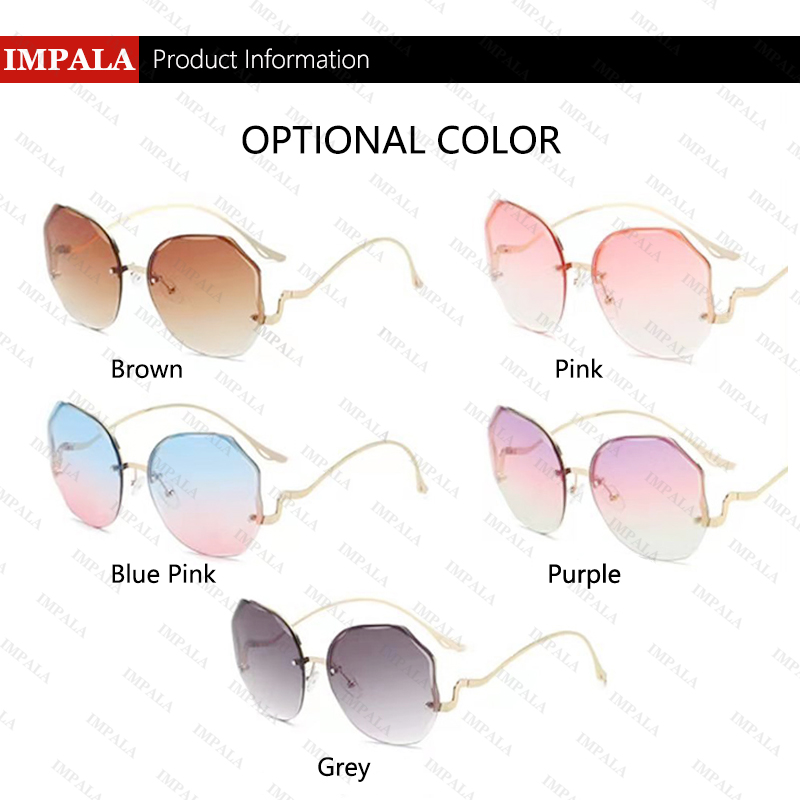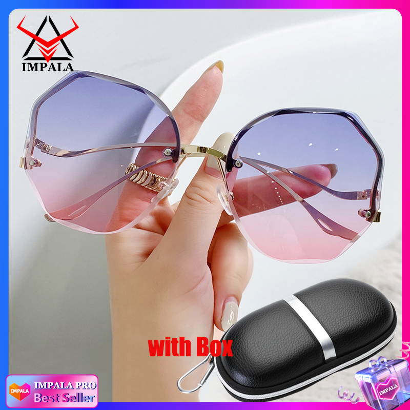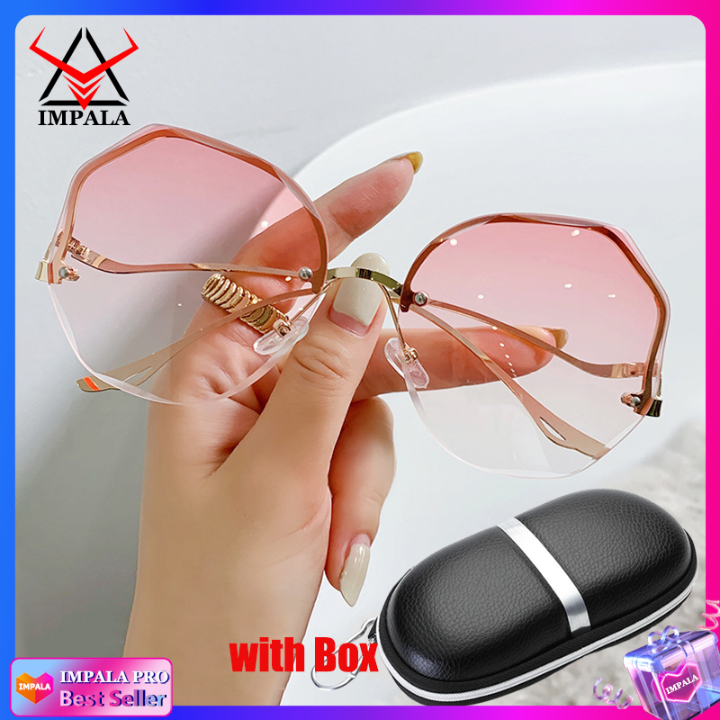 IMPALA QT3001L Fashion Rimless Sunglasses for Women Korea Style Sun Glasses for Female Sand Beach Eyewear UV Protective HD Lens Black Pink Blue Lens Optional with Box