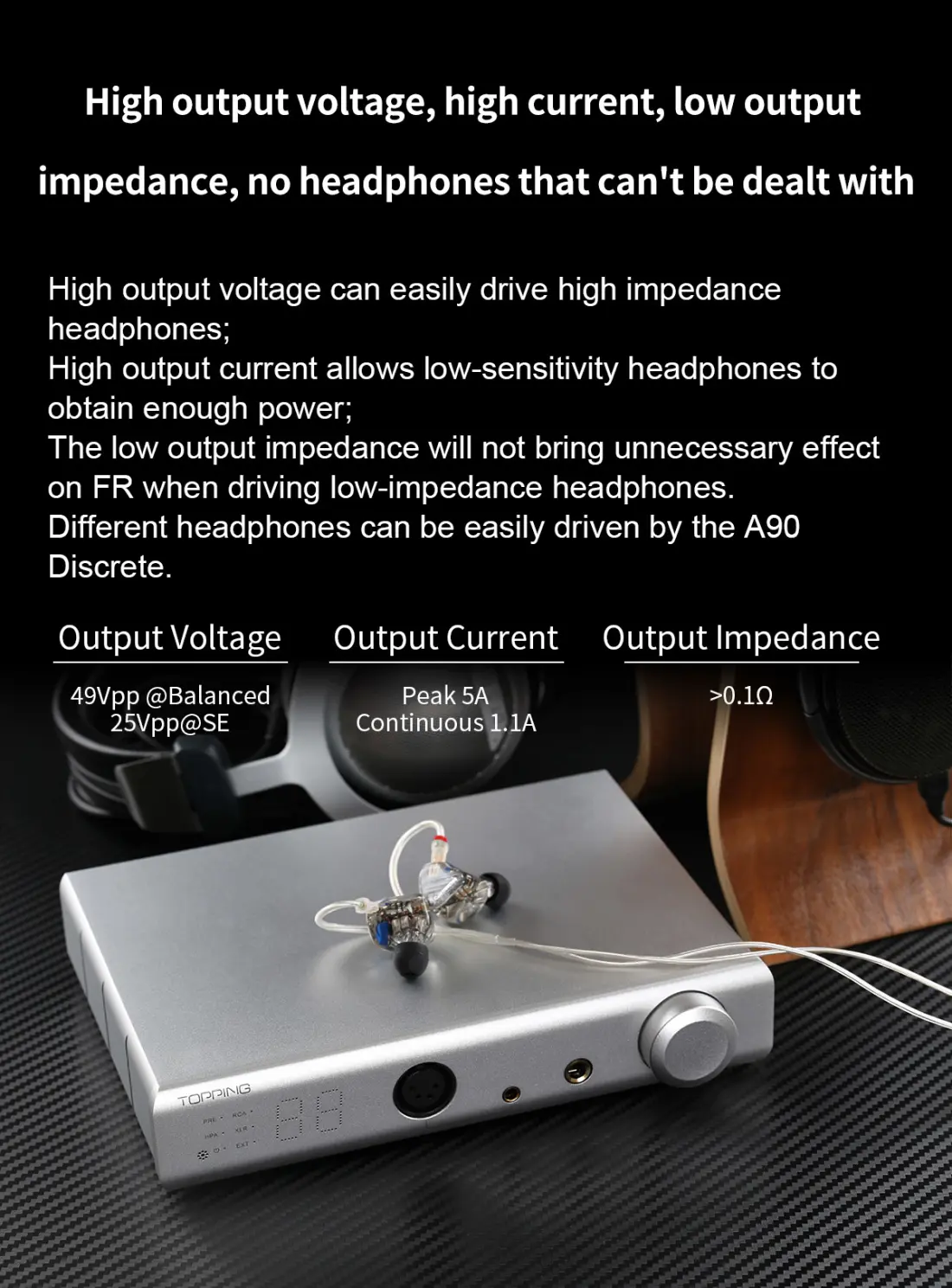 > Planar magnetic, electrostatic, dynamic drivers, IEMs—pick your poison, the A90D can handle it. Thanks to its high output voltage, high output current, and low output impedance, the A90D can push loads of power into high-impedance full-sized headphones or pare that power back in order to drive sensitive IEMs. And with an ultra-low noise rating and high dynamic range, the A90D does it all without producing any audible noise.