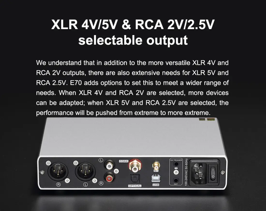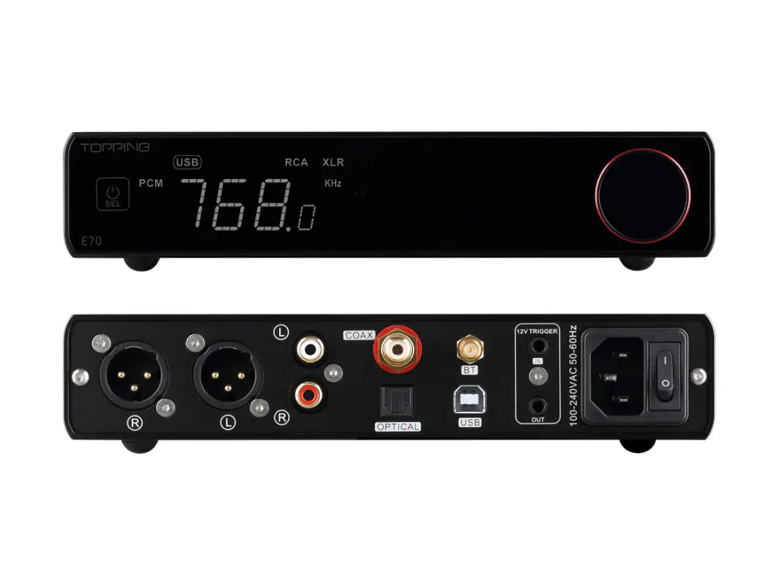 > Plug in your turntable, CD player, TVs, and game consoles into the E70 via optical or coaxial. Supporting 24bit/192kHz PCM and DSD DoP64 audio, the E70 will breathe new life into your favorite sources.