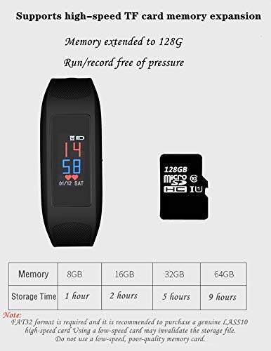 Battery for vedio recording 1.5 hours, battery for voice recording 3-4 hours. 32GB TF card can recod 4 hours 1080P vedio in .avi file.
