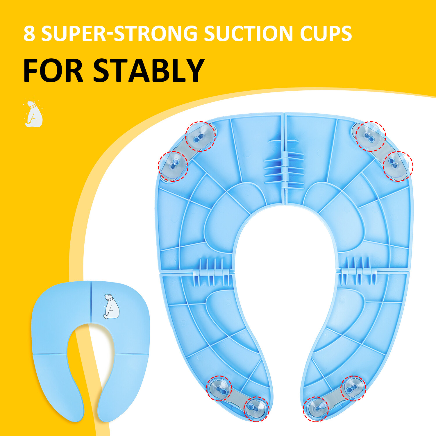 It has 8 suction cup grips around it to ensure you child is secure as possible while learning how to use the bathroom.