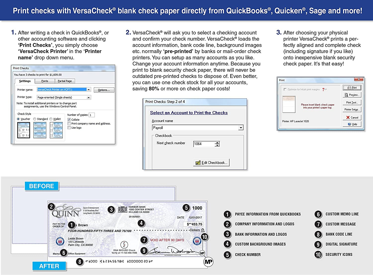 Includes VersaCheck Software Download, License for 5 Users, and 165 Print Validation codes. Additional print codes included FREE in VersaCheck Check Paper packaging.